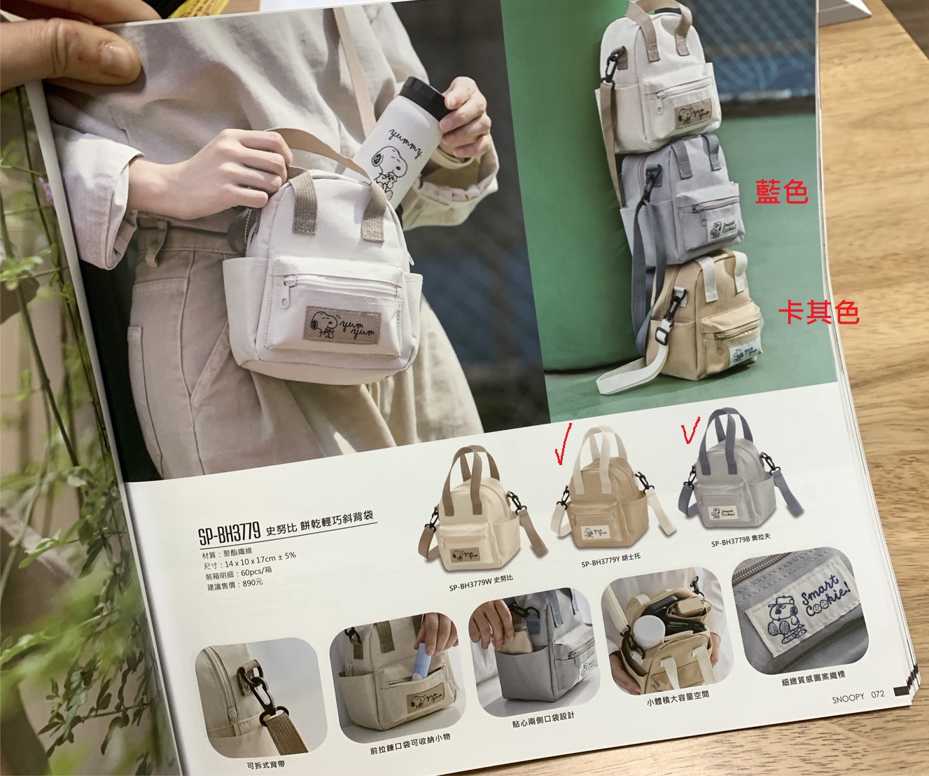 (3)史努比 餅乾輕巧斜背袋 (顏色選項:卡其色、藍色)