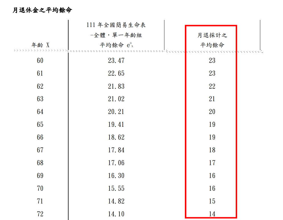 不同年齡的平均餘命表,請參考下圖(年金生命表)